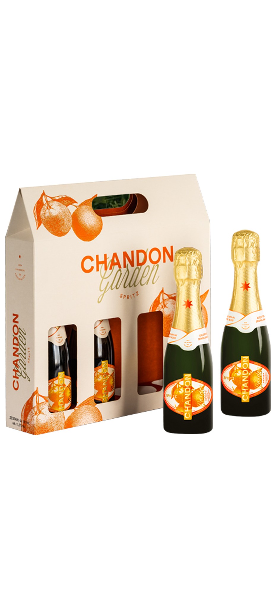 Chandon Garden Spritz to połączenie niezwykłego wina musującego z wyjątkową recepturą bitters’a powstałego z lokalnie uprawianych pomarańczy. Owoce zbierane są z upraw ulokowanych na wysokości około 1000 metrów, w winnicy Mendoza, następnie są macerowane ze skórkami suszonych pomarańczy, ziołami oraz przyprawami takimi jak kardamon, czarny pieprz i rumianek, które przechodzą specjalną selekcję spośród najlepszych terroir na świecie. Chandon to mieszanka najwyższej klasy wytrawnych cuvée, wytwarzanych na bazie szczepów Chardonnay, Pinot Noir, Semillion.
