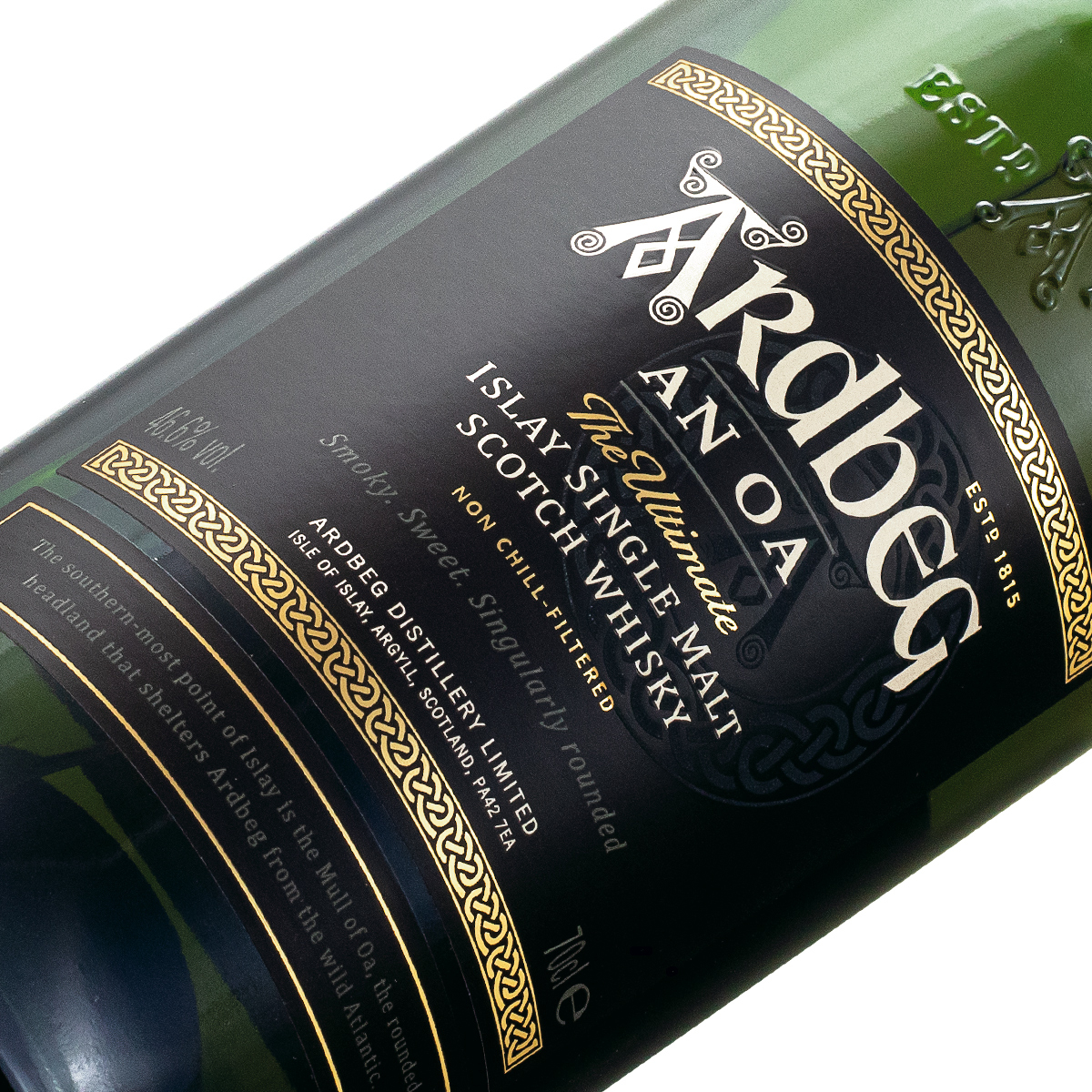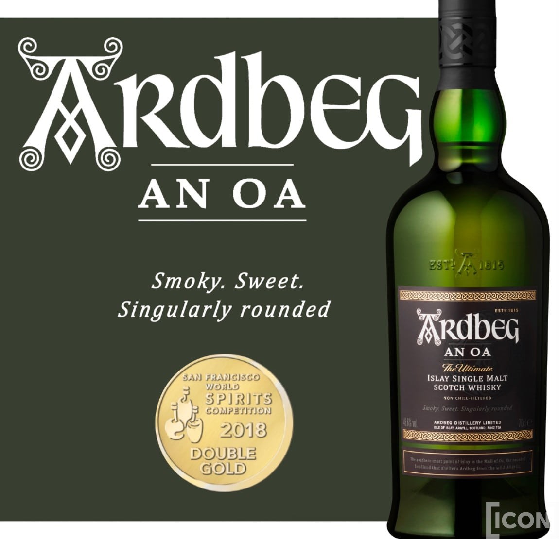 Ardbeg An Oa to whisky z charakterystyczną dla destylarni Ardbeg dymnością, która jednak przełamana jest łagodną słodyczą. Pojawiają się tutaj wyraźnie dominujące nuty dymne połączone z gorzką czekoladą oraz z odrobiną karmelu i przyprawami korzennymi.