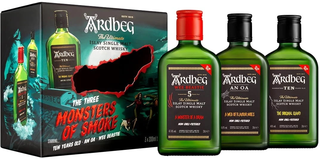 Ardbeg Monster Pack LIMITOWANA EDYCJA! to kolekcjonerski zestaw trzech wyjątkowych dymnych whisky od Ardbega! są to trunki z podstawowego asortymentu destylarni, która została zainspirowana kultowymi horrorami klasy B z lat 50-tych. Opakowanie to karykaturalna grafika na kartoniku z prześwitem ukazuje trzy butelki o pojemności 0,2l.