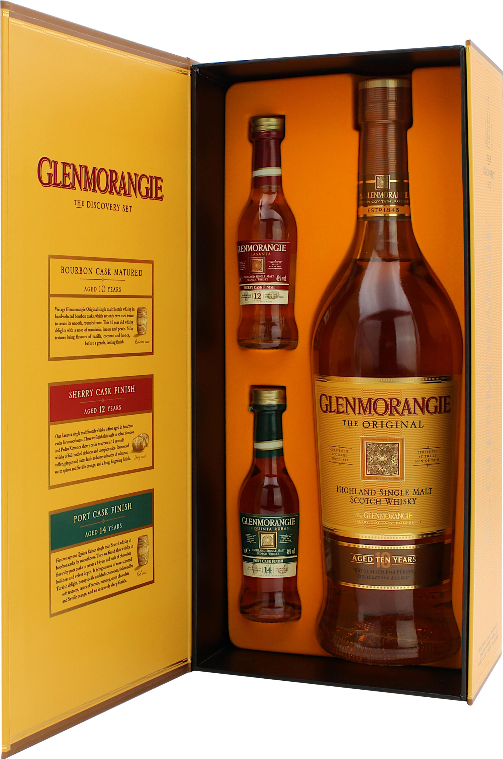 Limitowana oferta Glenmorangie The Original 10 Y.O. Discovery Pack 40% + 2 miniaturki zawiera butelkę Glenmorangie The Original 10 Year Old w zestawie z dwoma miniaturami kolekcji Extra Mature Range (Glenmorangie The Lasanta i Glenmorangie The Quinta Ruban).