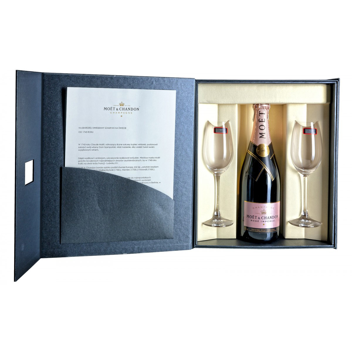 Ekskluzywny zestaw prezentowy zawiera butelkę szampana Moët & Chandon Rosé Impérial i dwa prestiżowe kieliszki marki Riedel, najbardziej cenionego producenta szkła do win, którego specjalnością jest tworzenie kieliszków do kategorii wina, a nawet do konkretnych szczepów. Wszystko umieszczone w prestiżowym, dedykowanym tym produktom opakowaniu. To propozycja dla najbardziej wymagających, oczekujących najwyższej klasy oferty.