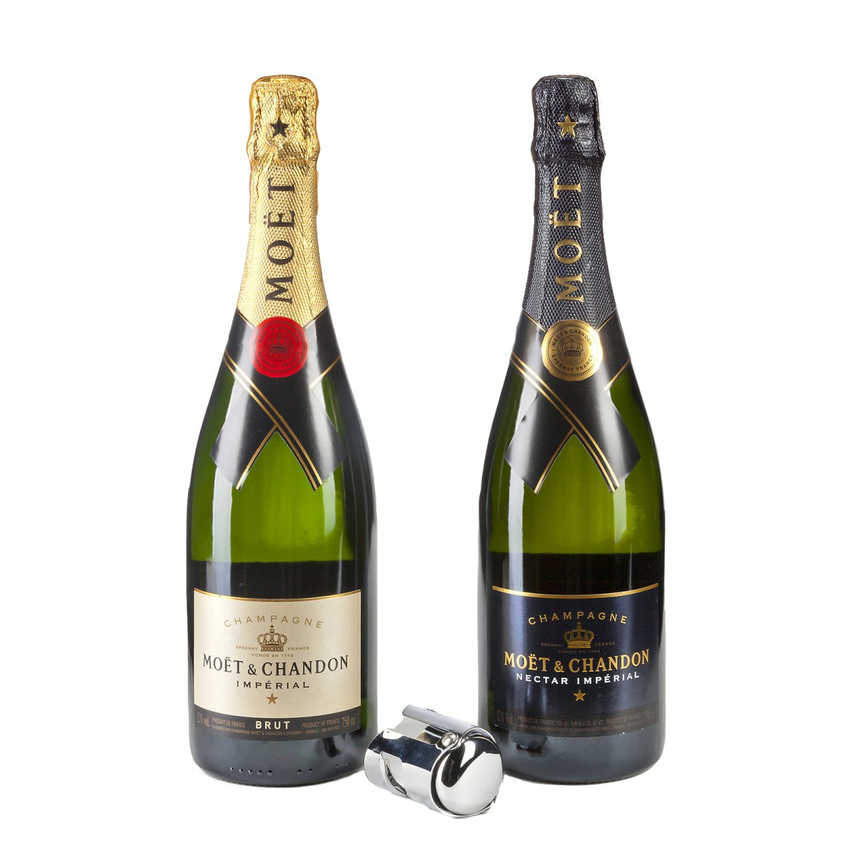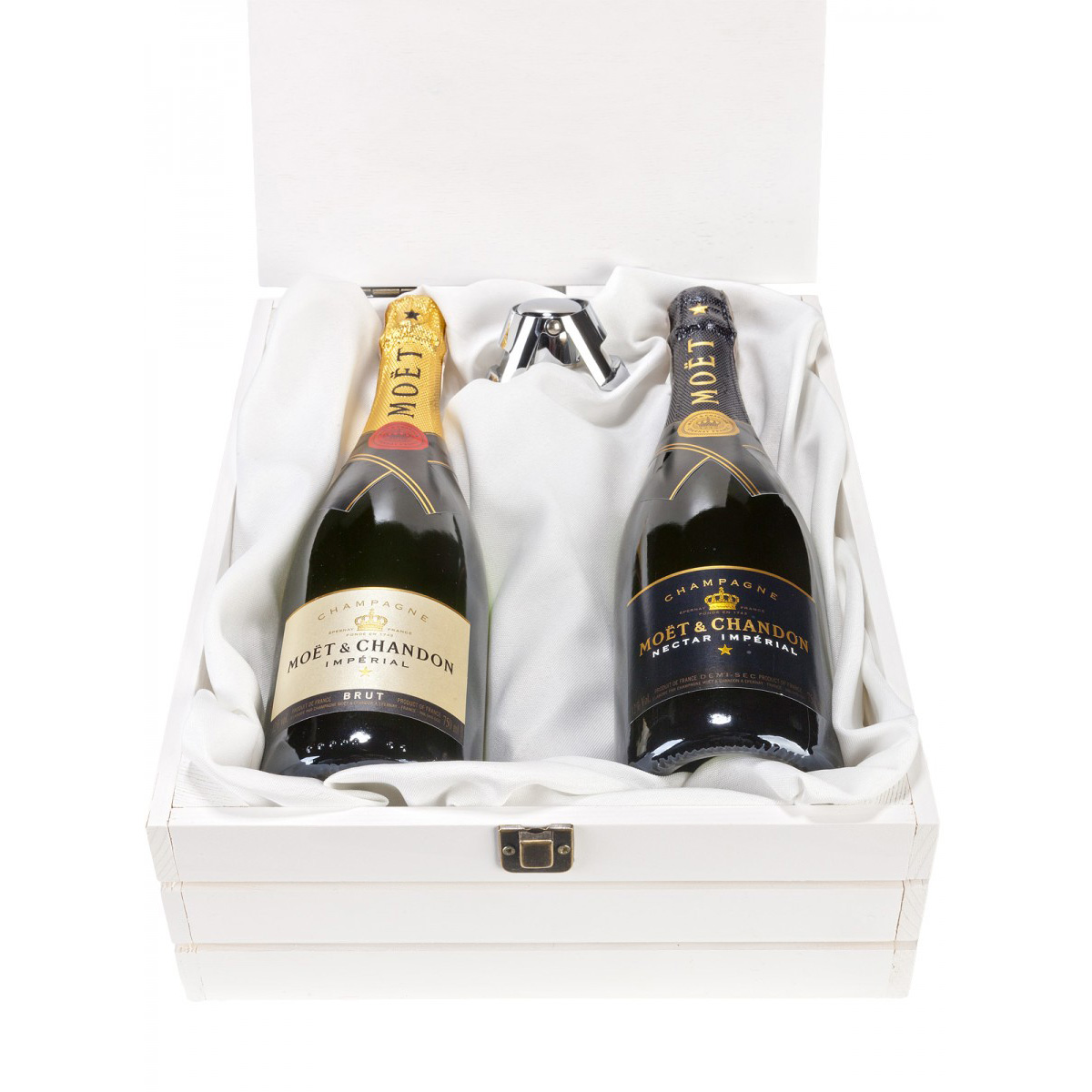 Zestaw zawiera dwie odmiany szampana Moët & Chandon – Impérial i Nectar Impérial oraz praktyczny korek do szampana, który doskonale utrzymuje bąbelki w butelce, perfekcyjny dodatek, gdy chcemy pozostałą zawartość wina zachować w doskonałej kondycji na „później”. Całość zapakowana w ażurowaną, drewnianą skrzynkę.