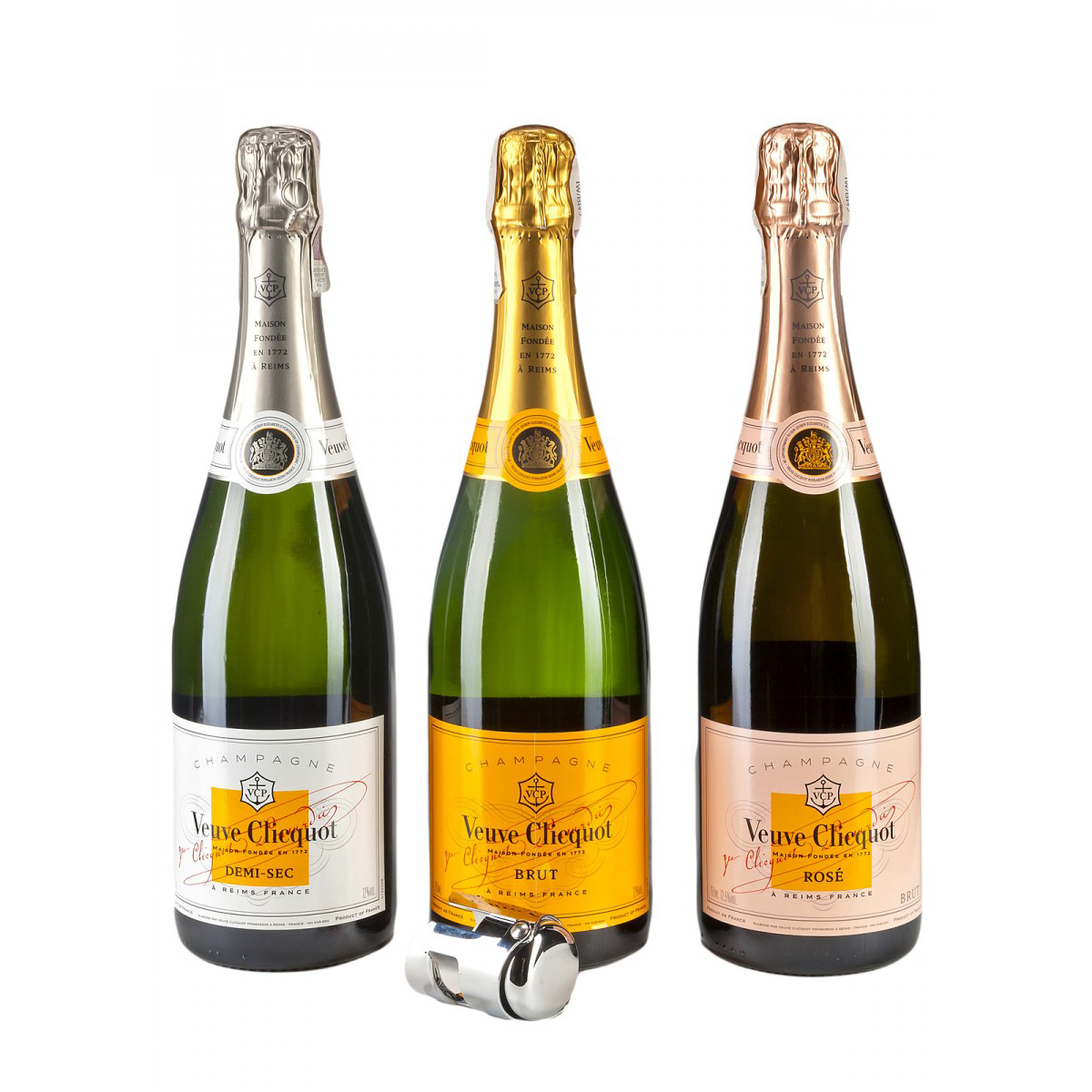 Zestaw prezentowy szampany Veuve Clicquot 3 w skrzyni drewnianej zawiera: szampan Veuve Clicquot Brut poj.0,75l, szampan Veuve Clicquot Demi-Sec poj.0,75l, szampan Veuve Clicquot Rose poj.0,75l, korek do szampana, skrzynia ażur drewniana.