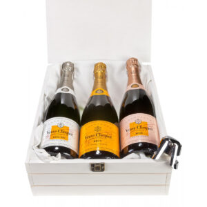 Szampan Veuve Clicquot Brut poj.0,75l, szampan Veuve Clicquot Demi-Sec poj.0,75l, szampan Veuve Clicquot Rose poj.0,75l, korek do szampana, autorska skrzynia ażur drewniana.