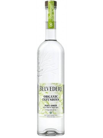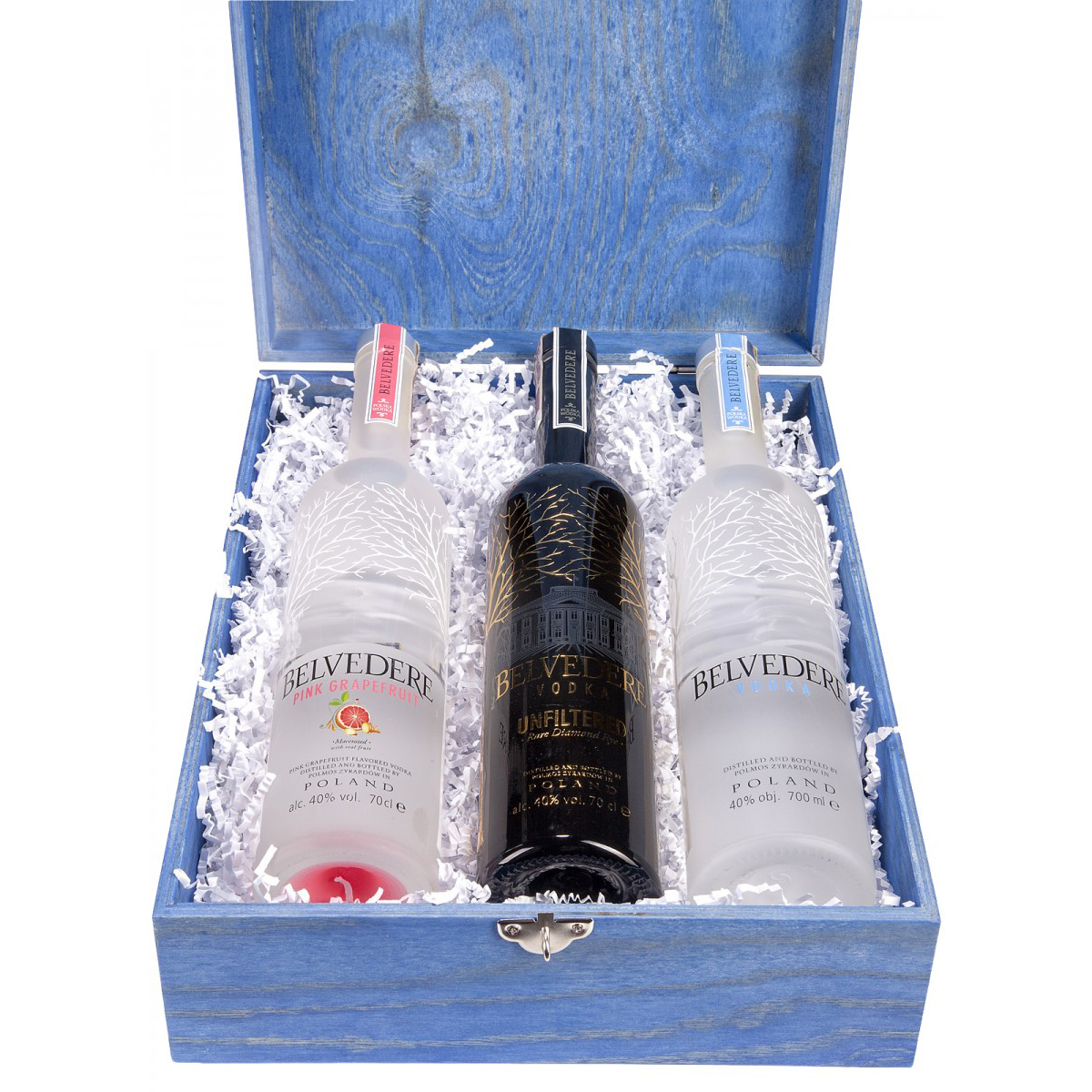 Wódka BELVEDERE 0,7l, wódka BELVEDERE ORGANIC INFUSIONS LEMON & BASIL 0,7l, wódka BELVEDERE ORGANIC INFUSIONS PEAR & GINGER 0,7l, skrzynia drewniana.